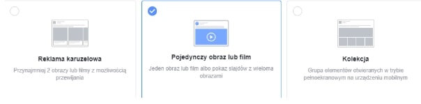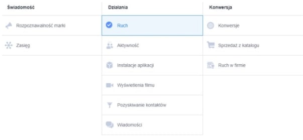 Pierwszym krokiem, podczas tworzenia reklamy na Facebooku, jest wybranie jednego z dostępnych celu kampanii: