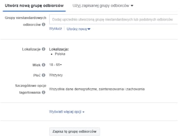 Kolejnym krokiem jest to utworzenie grupy odbiorców – czyli wyznaczenie kryteriów, według których mają zostać wybrani użytkownicy, którym wyświetli się reklama.