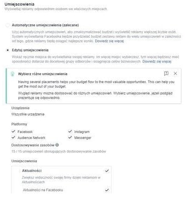 W zależności od celu, możesz również manualnie wybrać umiejscowienie swoich reklam: