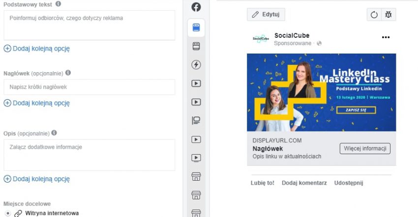 - Link – czyli dokąd ma prowadzić nasza reklama – na stronę z zapisami czy do sklepu?